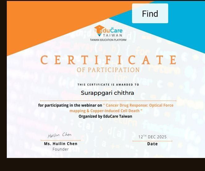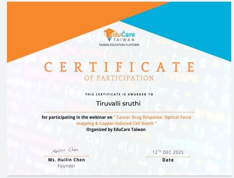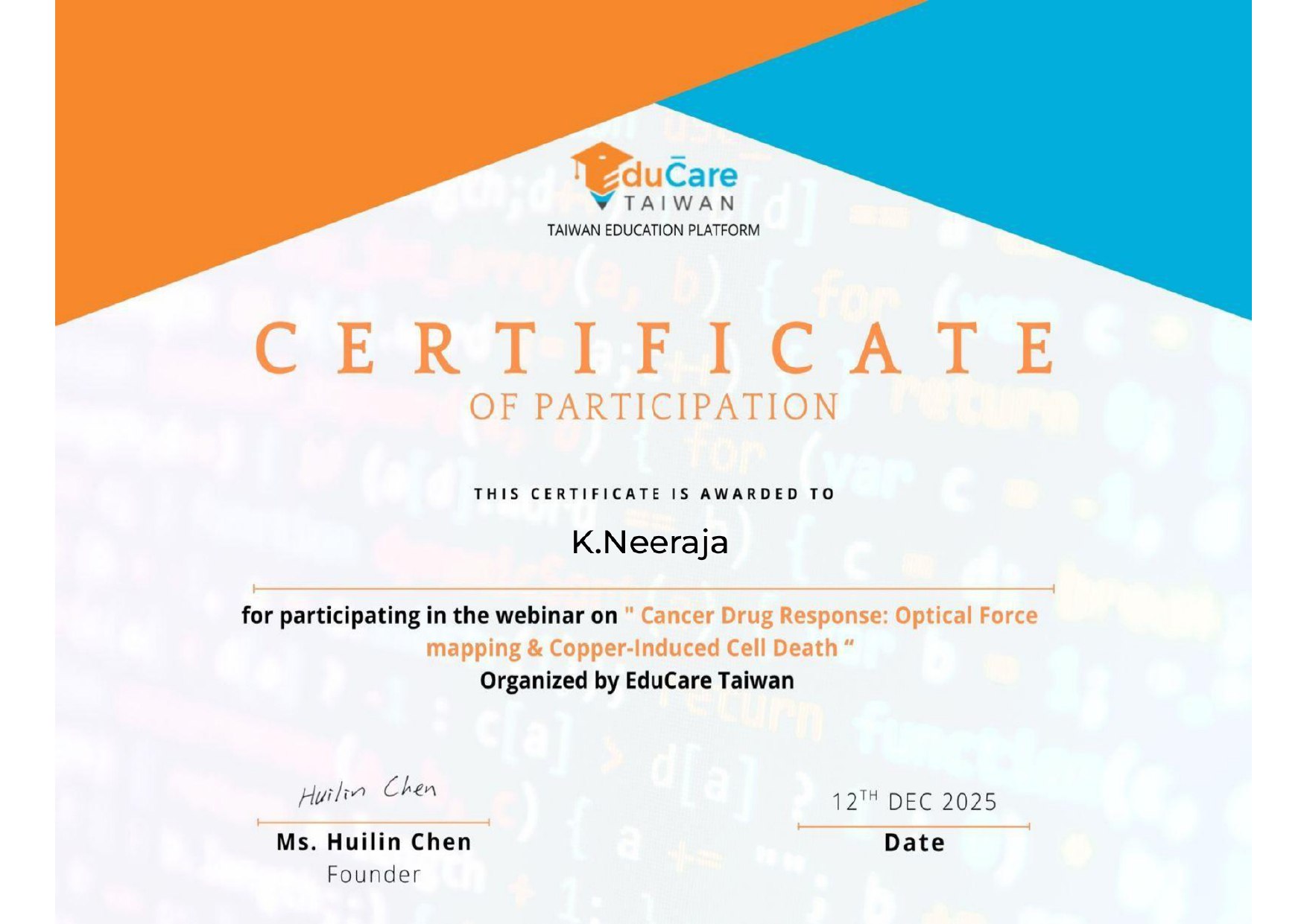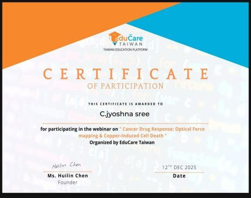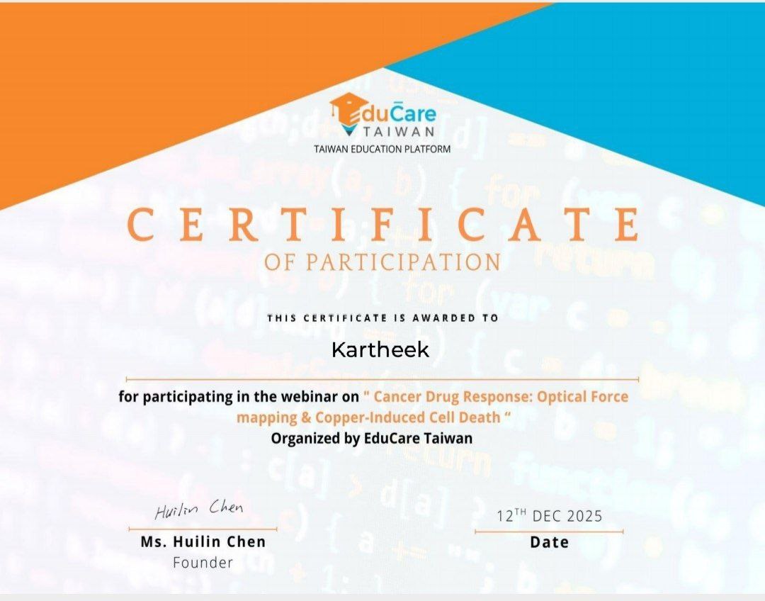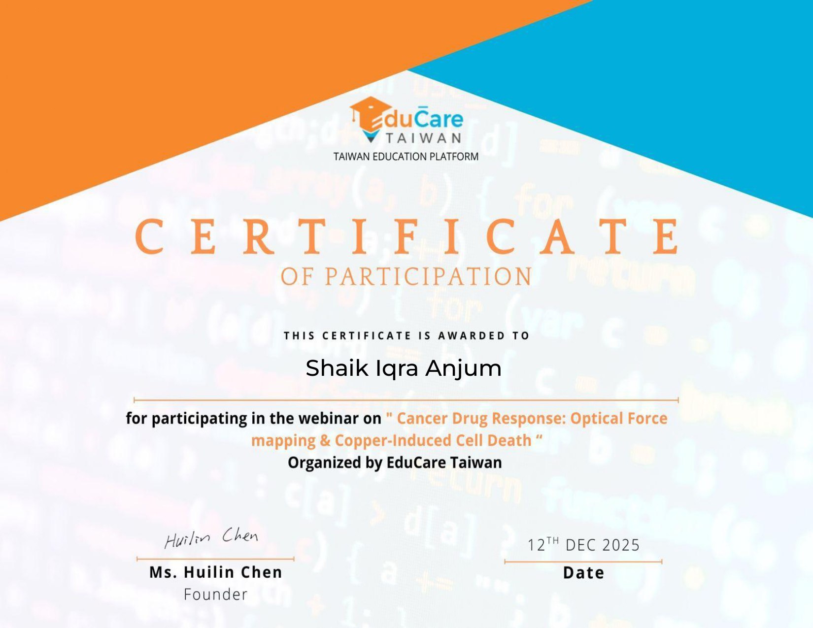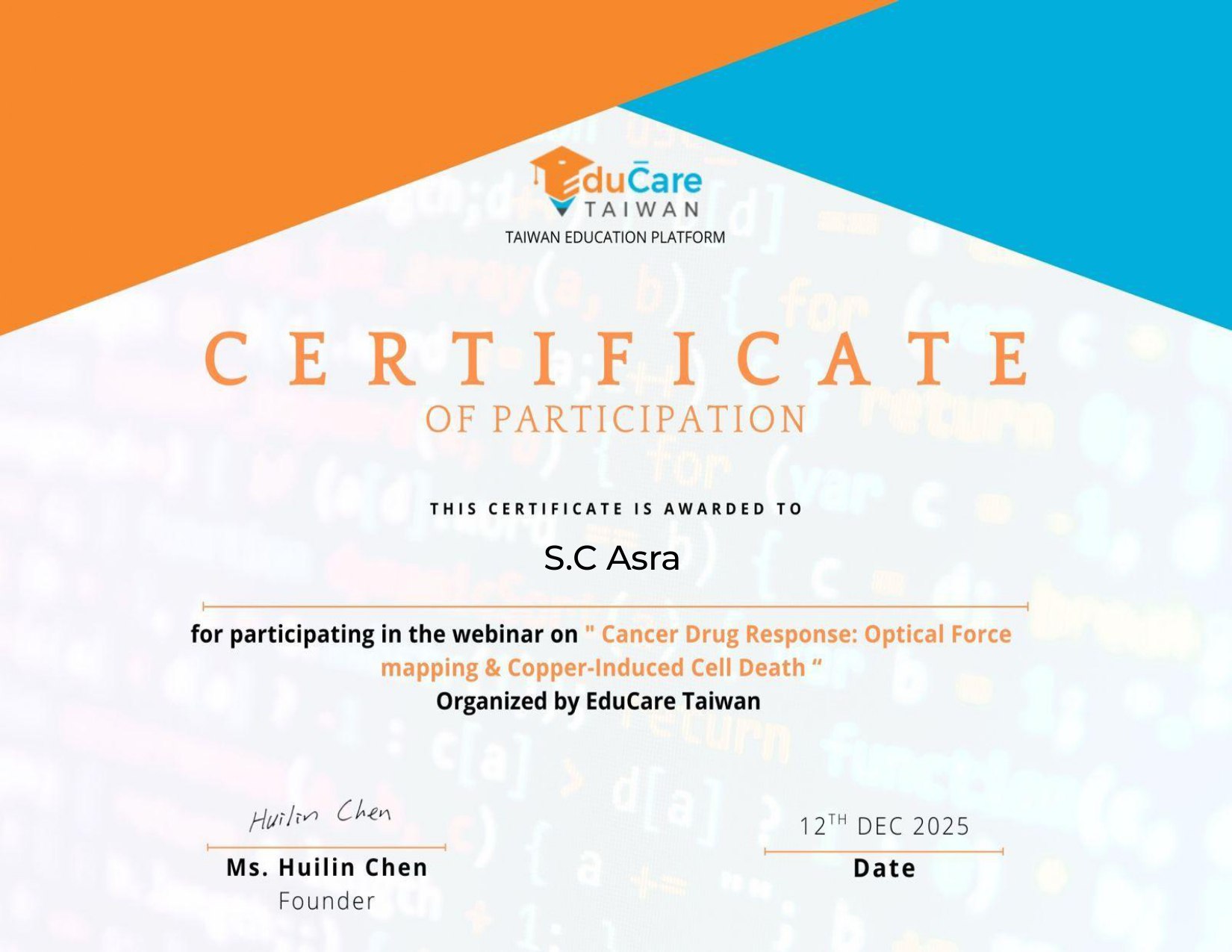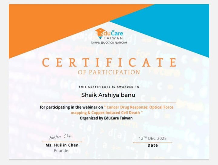 12-DEC-2025 : Students participated in webinar on "cancer drug response - optical force mapping and copper induced cell death" organised by educare, Taiwan